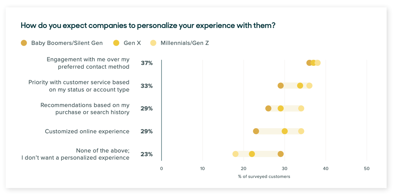 Deliver unique experiences by personalizing every interaction with your customers. The Zendesk Customer Experience Trends Report shows that 76 percent of consumers expect personalization. They want brands to take the information they have about them and use it to make their experience better—whether that means using their preferred method of engagement or offering specific recommendations based on their purchase history.